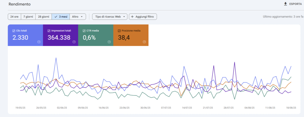 La schermata iniziale ti presenta una panoramica immediata dello stato di salute del tuo sito, con metriche chiave come impressioni, clic, CTR (Click-Through Rate) e posizione media negli ultimi tre mesi. Ogni elemento del dashboard è progettato per fornirti informazioni actionable.